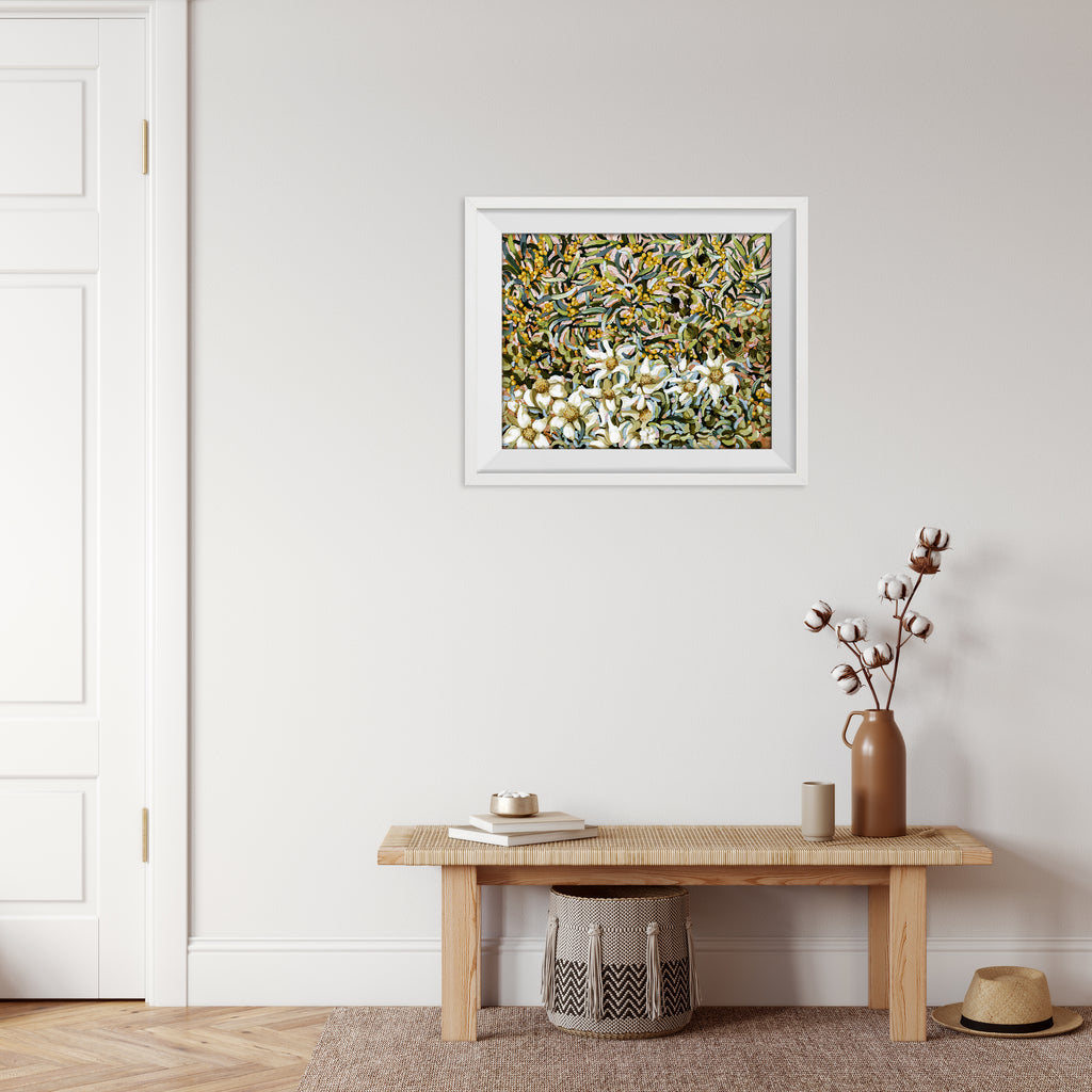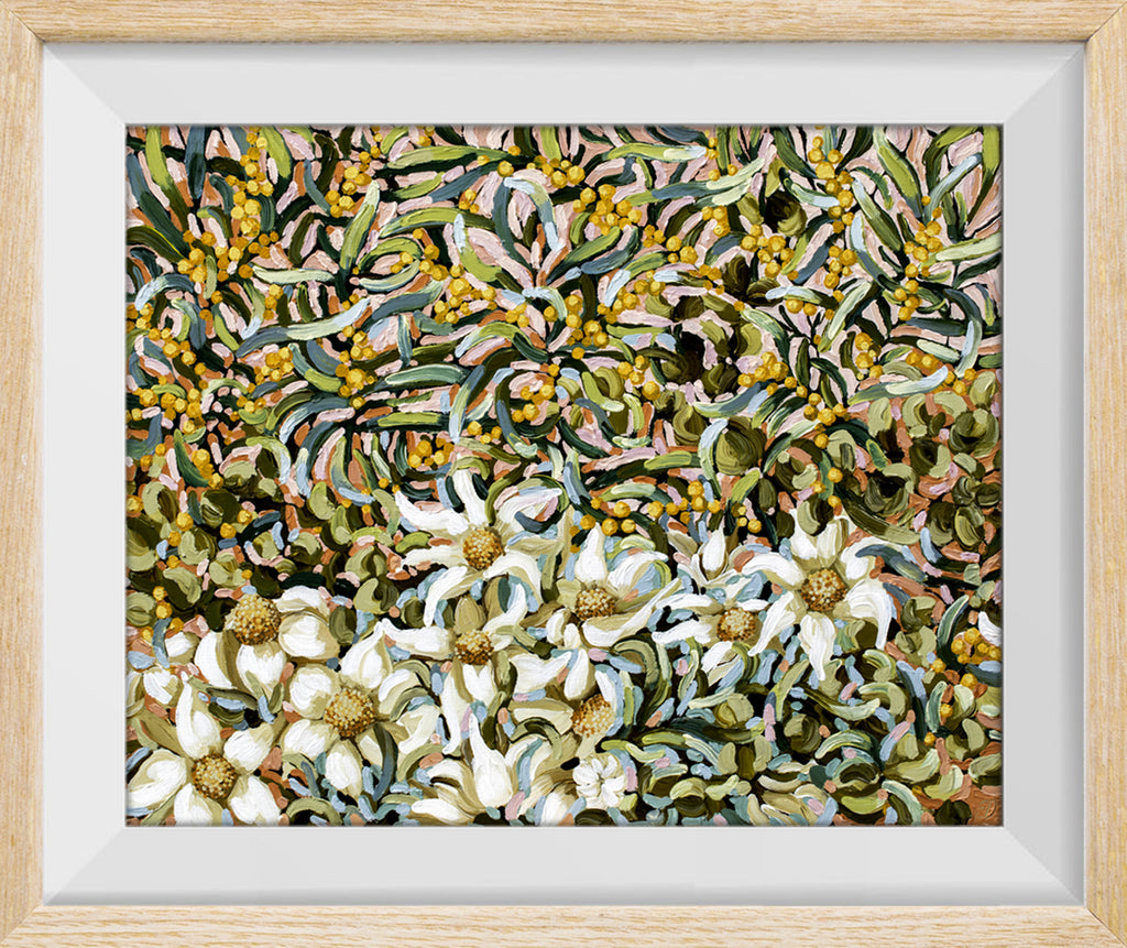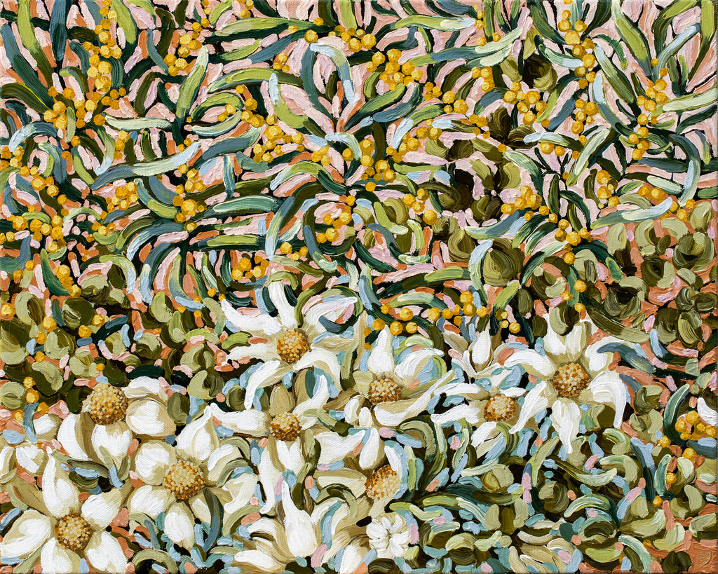 This piece began as a homage to the lush wattle blooms that I documented across different seasons and states of Australia. As I studied the relationship between floral and foliage, I began to subconsciously add in other floral elements such as the flannel flower, against a backdrop of pastel skies, until the final piece transformed into a garden of the mind that I curated for myself.